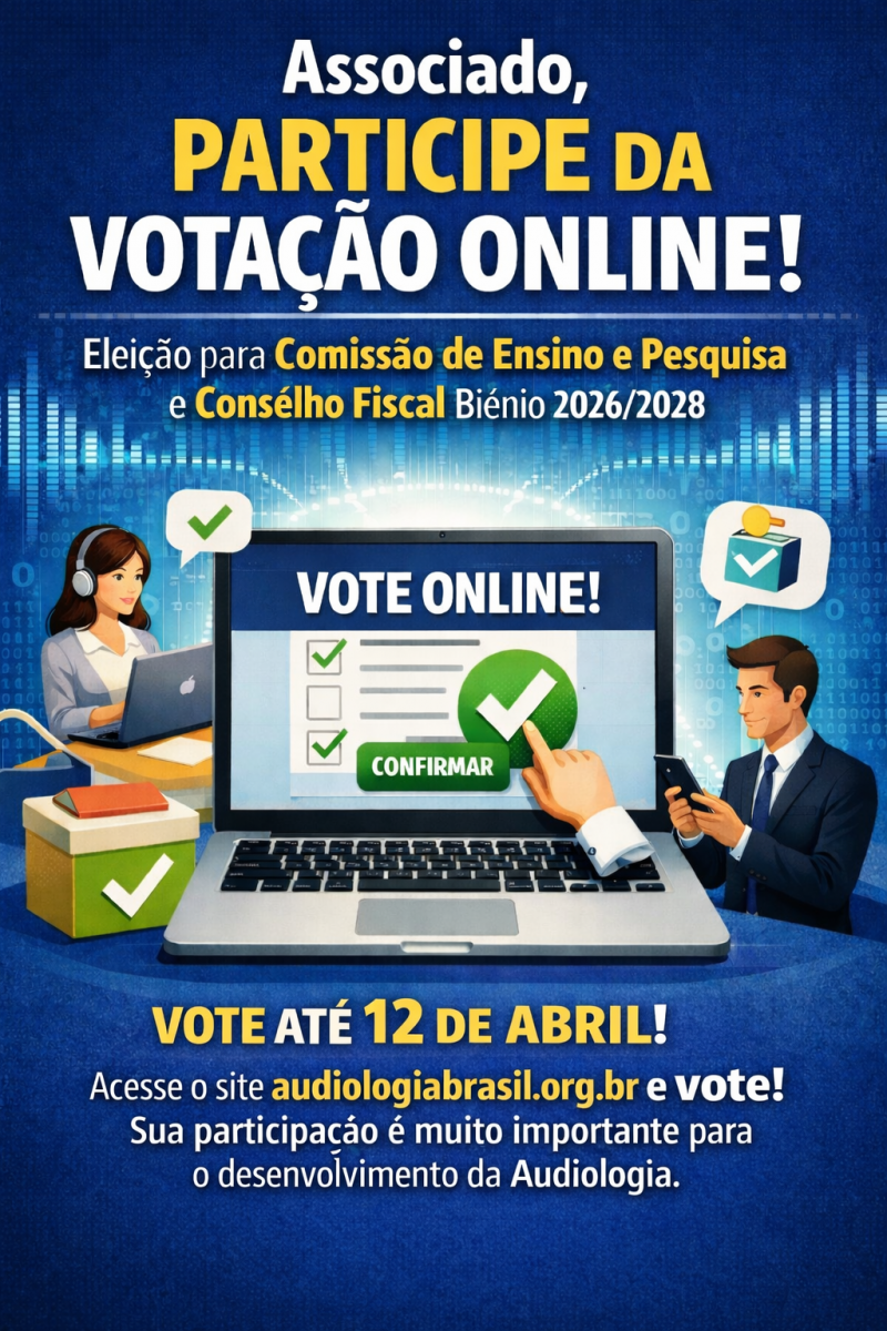 Menu principal ABA ABA Institucional Institucional Quem SomosMissãoObjetivosHistórico Gestões Gestões Gestão atual Gestão atual Membros da diretoriaConselho FiscalComissão de Ensino e PesquisaComitê de novos talentos Representações Regionais Representações Regionais Representantes das Seções RegionaisHistórico das Representações RegionaisVigênciaDinâmica de TrabalhoDinâmica de trabalho e equipeMetas e açõesAgenda de ReuniõesHistórico das gestões Certificação ABA Certificação ABA Certificacao EditaisCertificaçãoCertificação LoginFonoaudiólogos Tutores e Fonoaudiólogos Certificados Prêmios e Homenagens Prêmios e Homenagens Mérito em AudiologiaNotícias Eventos Eventos EIA - HistóricoEIA - Edição AnterioresEventos Parceiros da ABADivulgue o seu Evento Cursos Cursos Cursos OnlineCursos Promovidos pela ABACursos InternacionaisCertificados de Cursos EaDFóruns Publicações Publicações LivrosPeriódicosAtualiza ABA Associe-se Associe-se BenefíciosCategorias de AssociaçãoPrograma Fidelidade ABAInvestimentoInstruçõesFICHA DE CADASTRO Para associados Para associados Estatuto Legislação Legislação LeisResoluçõesÁrea do associado