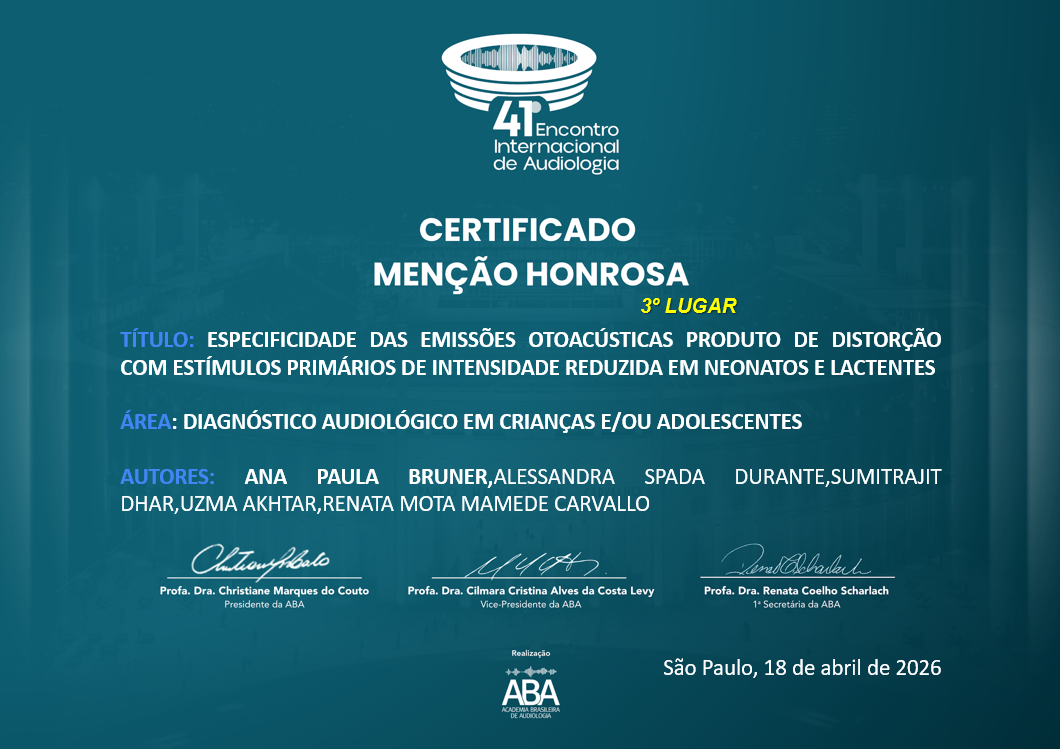 Menu principal ABA ABA Institucional Institucional Quem SomosMissãoObjetivosHistórico Gestões Gestões Gestão atual Gestão atual Membros da diretoriaConselho FiscalComissão de Ensino e PesquisaComitê de novos talentos Representações Regionais Representações Regionais Representantes das Seções RegionaisHistórico das Representações RegionaisVigênciaDinâmica de TrabalhoDinâmica de trabalho e equipeMetas e açõesAgenda de ReuniõesHistórico das gestões Certificação ABA Certificação ABA Certificacao EditaisCertificaçãoCertificação LoginFonoaudiólogos Tutores e Fonoaudiólogos Certificados Prêmios e Homenagens Prêmios e Homenagens Mérito em AudiologiaNotícias Eventos Eventos EIA - HistóricoEIA - Edição AnterioresEventos Parceiros da ABADivulgue o seu Evento Cursos Cursos Cursos OnlineCursos Promovidos pela ABACursos InternacionaisCertificados de Cursos EaDFóruns Publicações Publicações LivrosPeriódicosAtualiza ABA Associe-se Associe-se BenefíciosCategorias de AssociaçãoPrograma Fidelidade ABAInvestimentoInstruçõesFICHA DE CADASTRO Para associados Para associados Estatuto Legislação Legislação LeisResoluçõesÁrea do associado